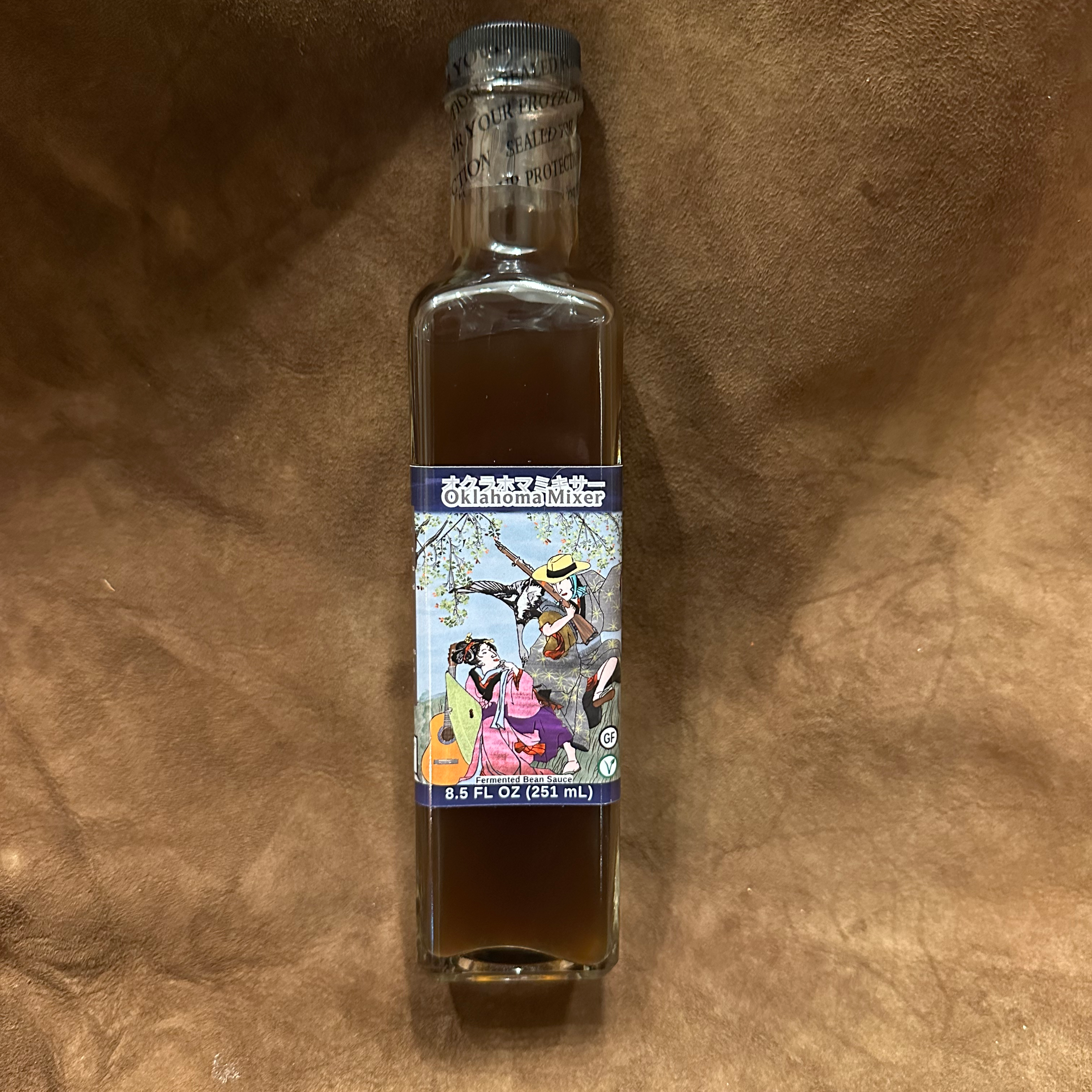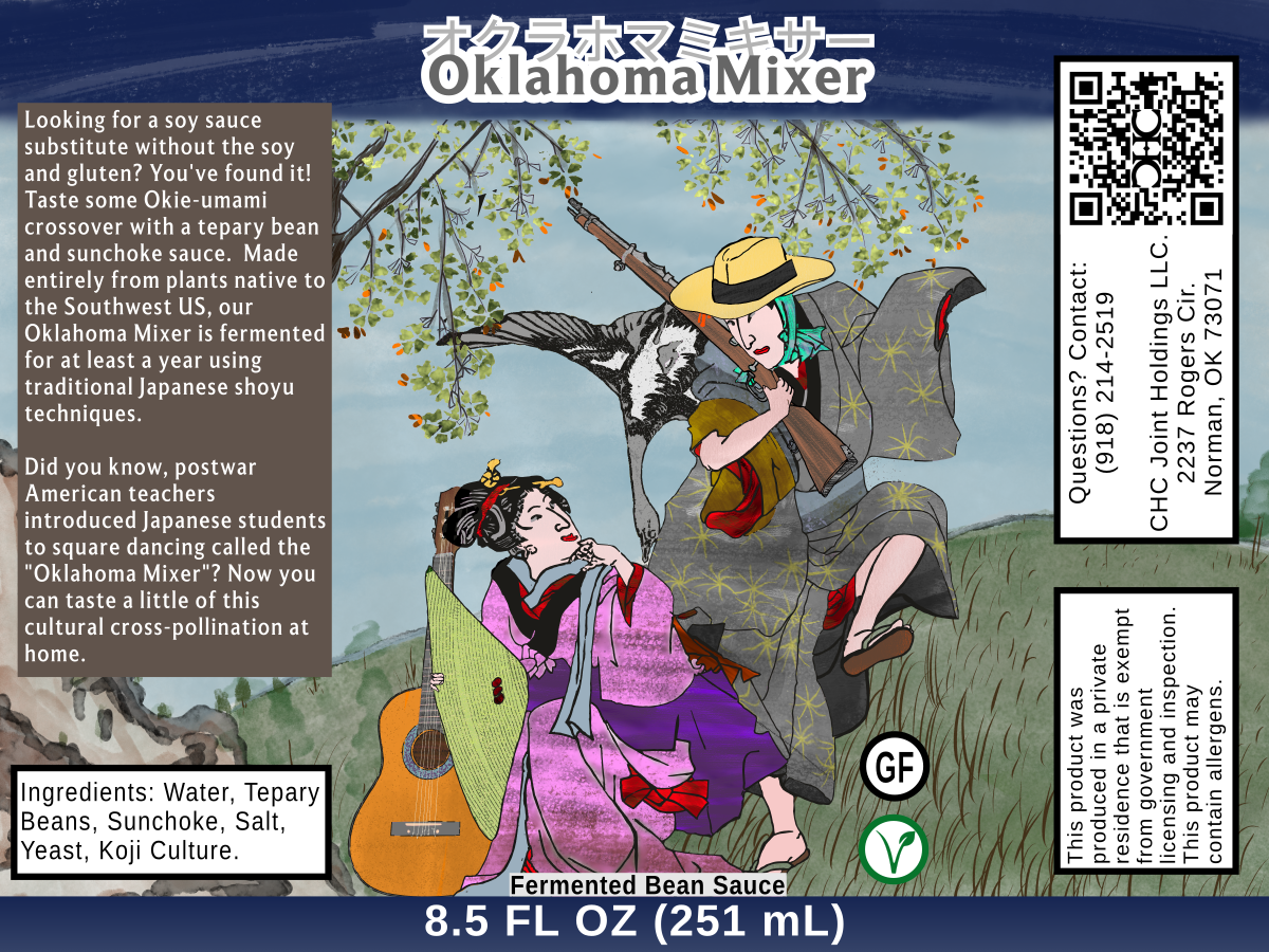 We named our cultural combination Oklahoma Mixer, in reference to a historical oddity where postwar American teachers introduced students to square dancing. A co-ed dance to Turkey in the Straw, the Oklahoma Mixer; オクラホマミキサー is something of a cultural meme which caught on like a wildfire (or perhaps a tsunami) in Japan. As we created a shared heritage after the war, so too did we wish to create something new and amazing. We ferment for 9+ months, followed by UV aging for at least a month. This sauce comes out much darker than our other sauces due to the natural color of the tepary beans we use and the level of roast on the sunchokes. The result has a surprisingly chocolately hint behind the savory sauce expected from soy sauce.