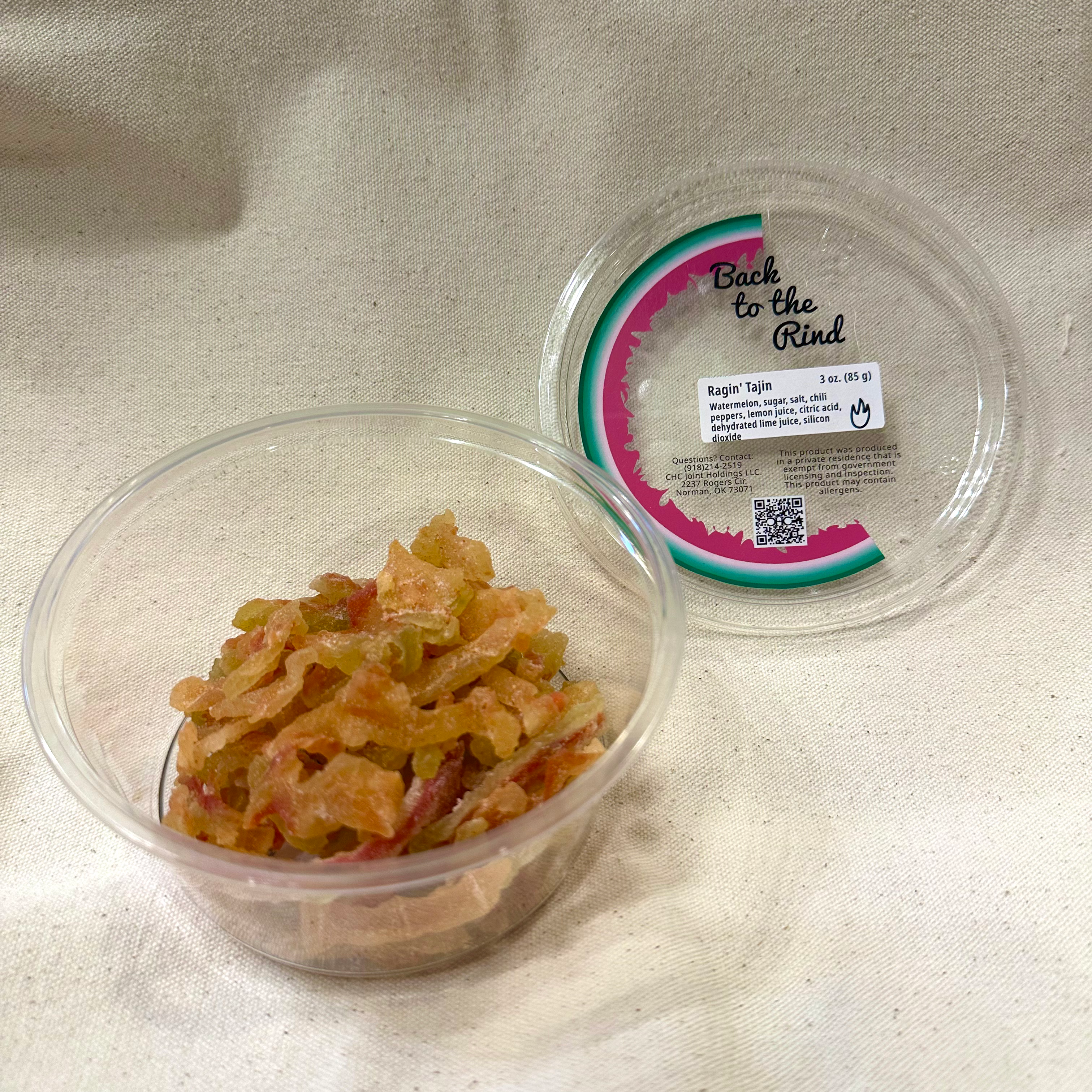 This is our Back to the Rind Ragin Tajin watermelon candy. In this one, we tossed our Classic Chew dehydrated fruit with some Tajin spice mix during the final coating. If you like some zing in your melon, this is the one for you.